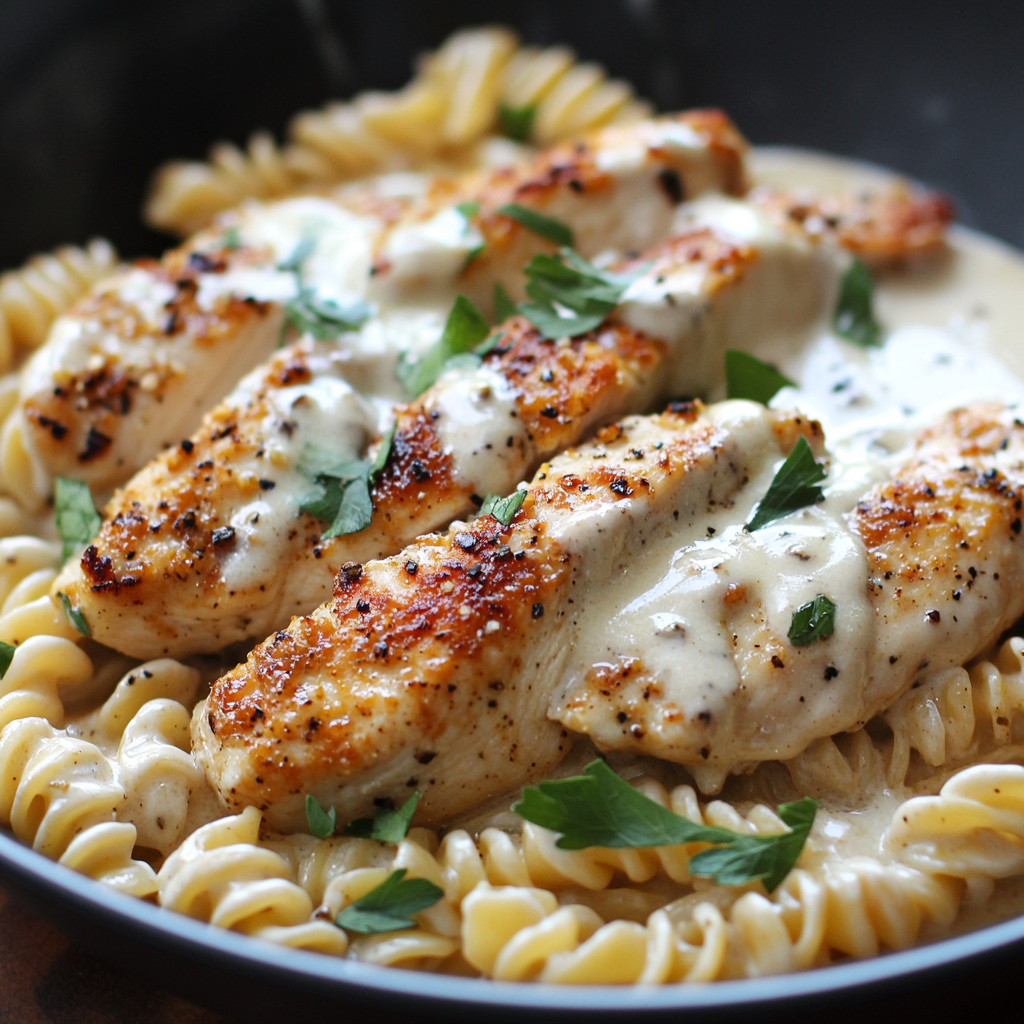 Creamy Garlic Chicken and Rotini with Mozzarella Alfredo