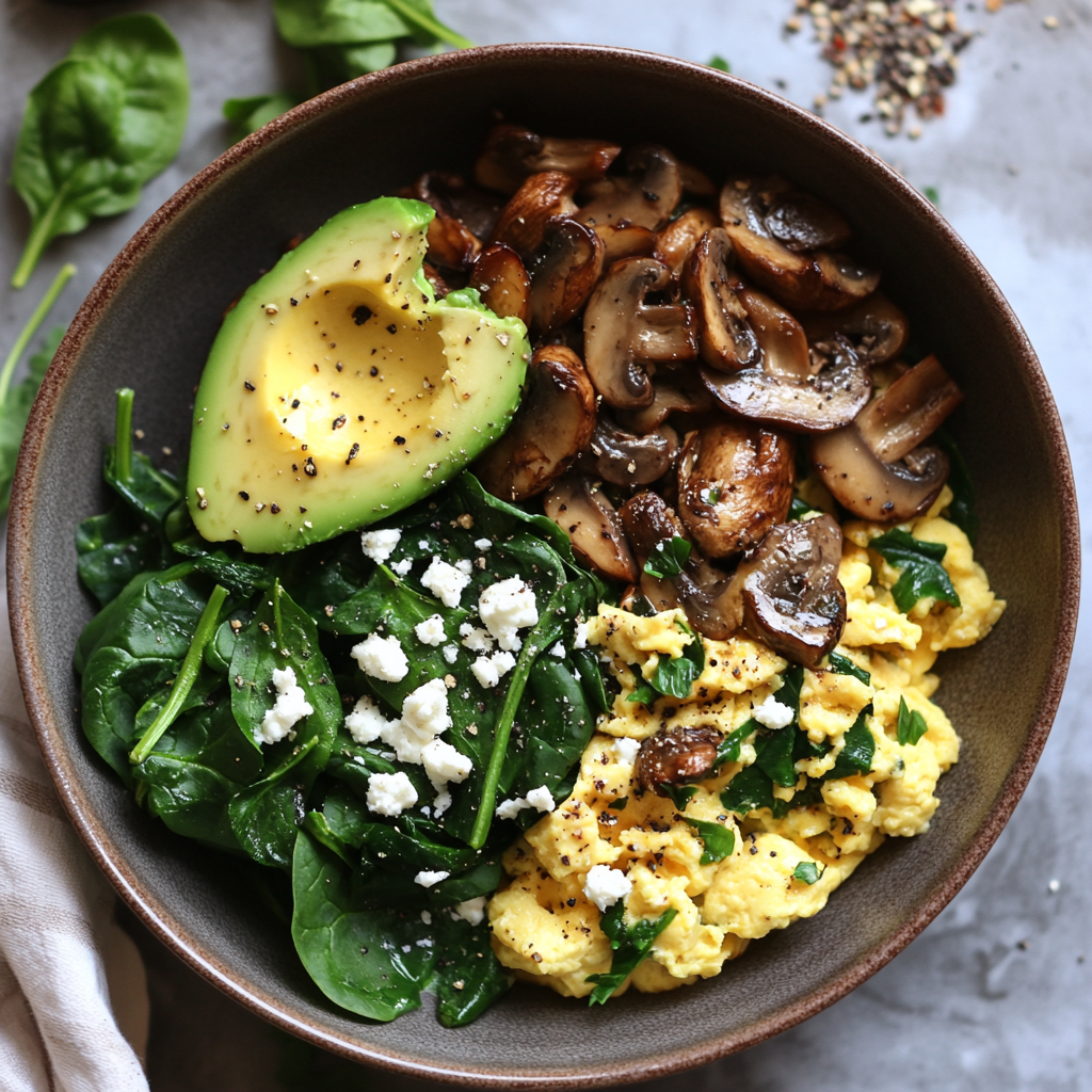 Start your day with a nutritious and satisfying breakfast bowl featuring Creamy Scrambled Eggs with Sautéed Mushrooms, Spinach & Avocado. This delightful dish blends fluffy scrambled eggs with the earthy flavors of sautéed mushrooms and vibrant spinach, all topped off with creamy avocado slices. Packed with protein and essential vitamins, this recipe is quick to prepare, making it perfect for busy mornings or leisurely brunches. Elevate your breakfast experience with this simple yet flavorful recipe that is sure to please everyone at the table.