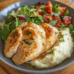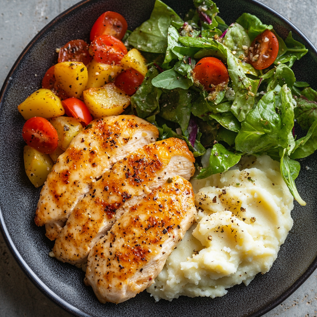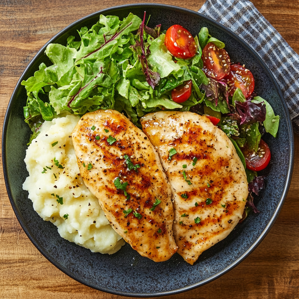 Golden Pan-Seared Chicken Breast with Creamy Mashed Potatoes & Fresh Garden Salad