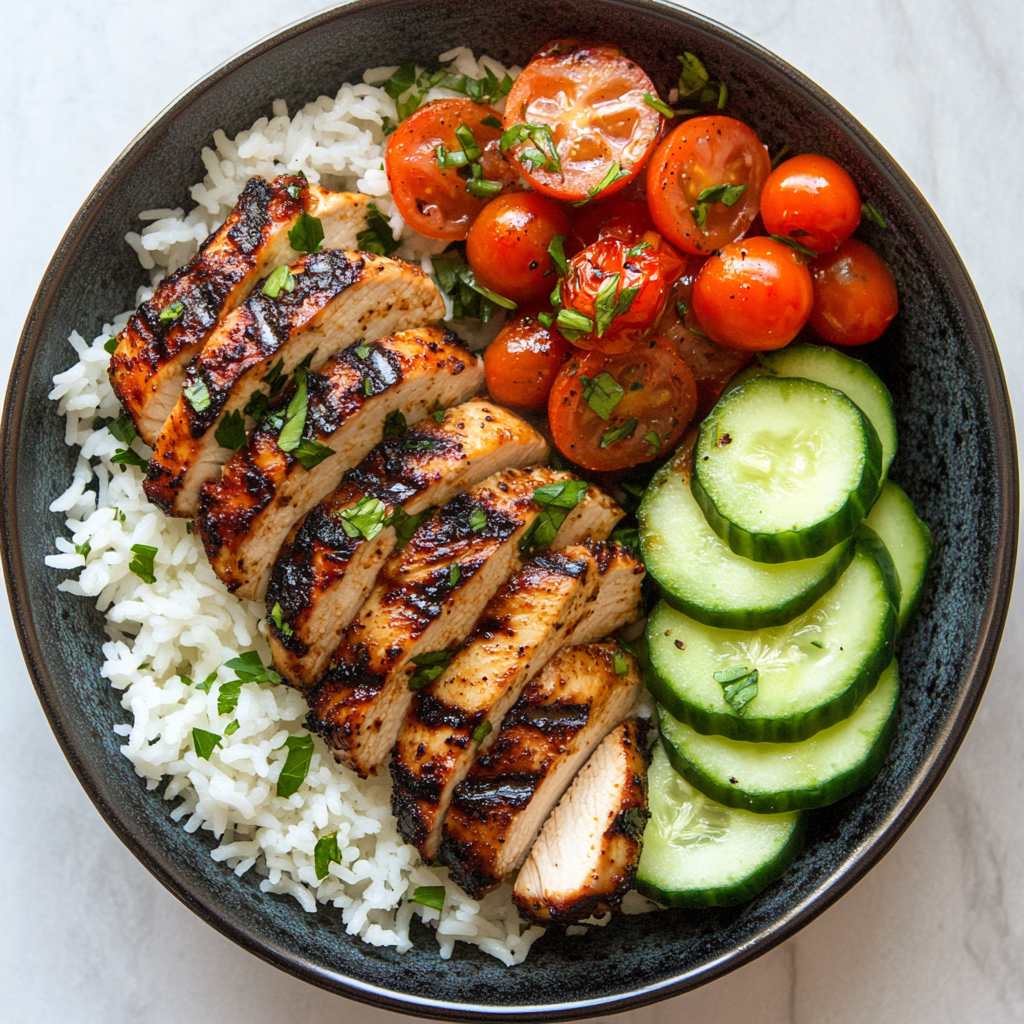 This dish features smoky grilled chicken breast paired with fluffy rice and a refreshing salad made from tomatoes and cucumbers, dressed lightly with olive oil and lemon juice.