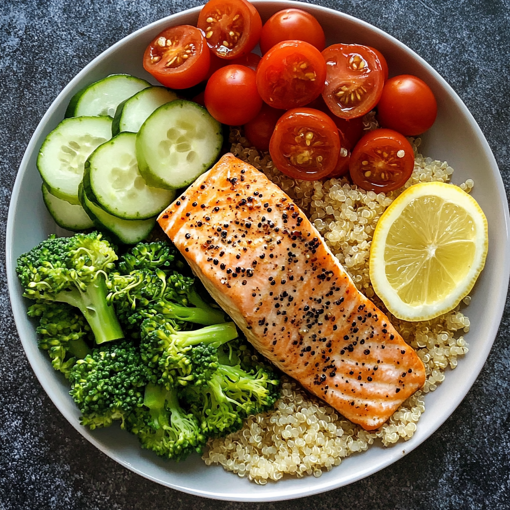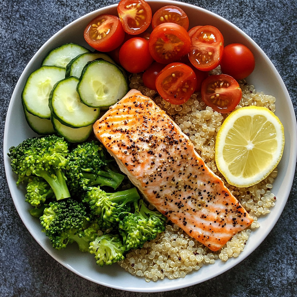 - Assemble your plate by placing the seared salmon alongside fluffy quinoa and topping with steamed broccoli, cucumber slices, and cherry tomatoes.