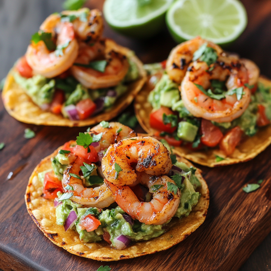 - Assemble tostadas by topping each shell with guacamole, grilled shrimp, and pico de gallo.
