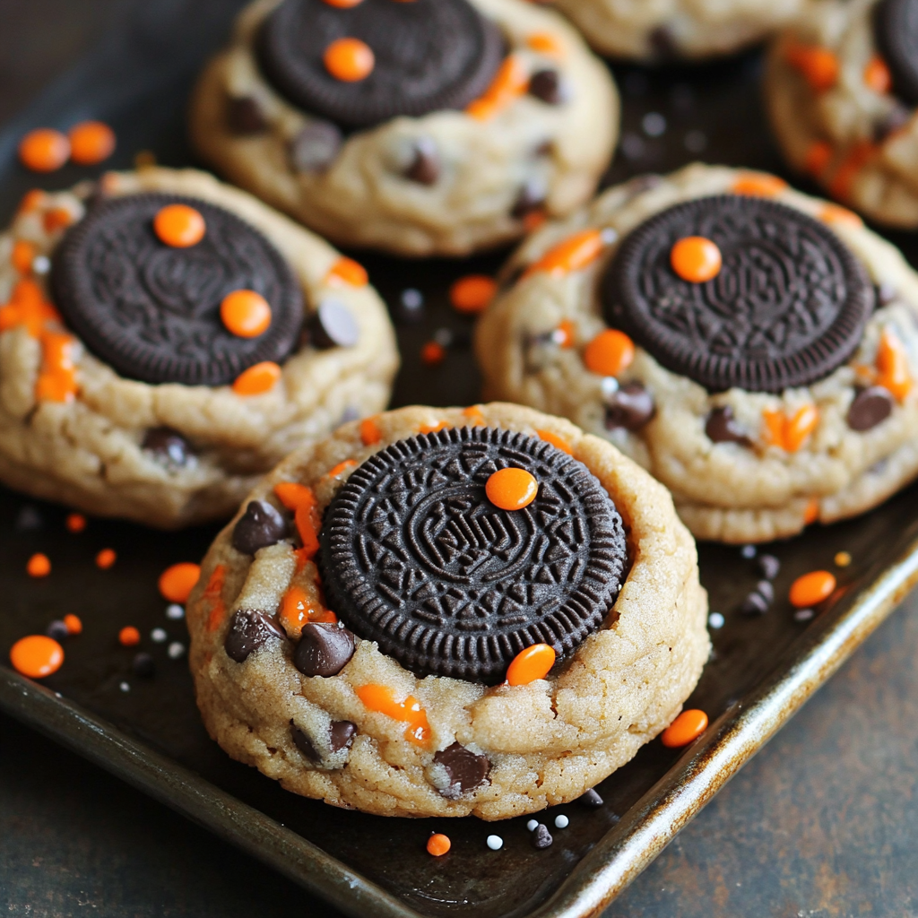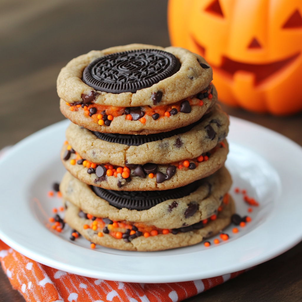 These Halloween Oreo stuffed chocolate chip cookies are the ultimate treat for your next Halloween party! With a deliciously gooey center and festive sprinkles, they are sure to impress guests of all ages. Perfect for gatherings, these cookies combine classic chocolate chip flavors with the fun twist of Oreo cookies, making them a unique addition to any dessert table.