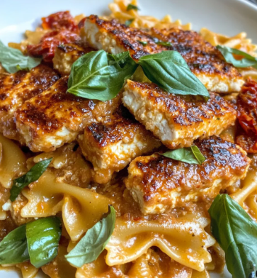 Remove from heat once crispy. Thinly slice fried tofu fillets before serving on top of your Marry Me Chicken Pasta (Vegan). Enjoy!