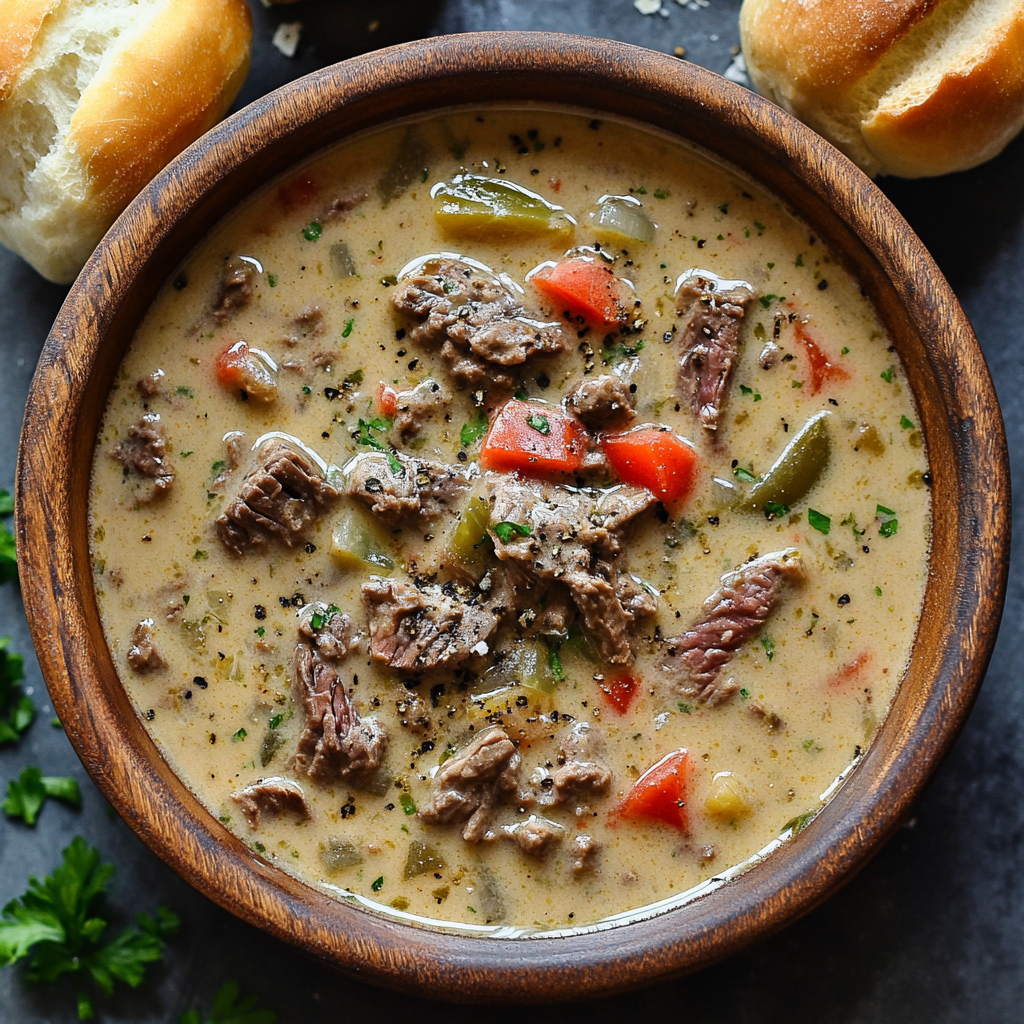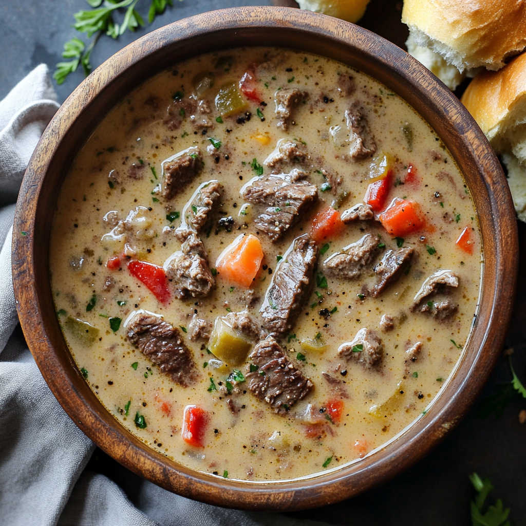 Hearty Philly Cheesesteak Soup with tender steak, sautéed vegetables, and a rich, creamy cheese sauce. Serve with crusty rolls.
