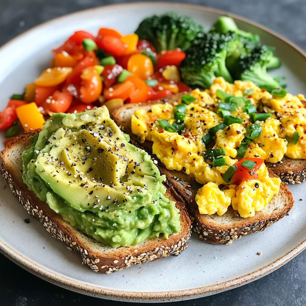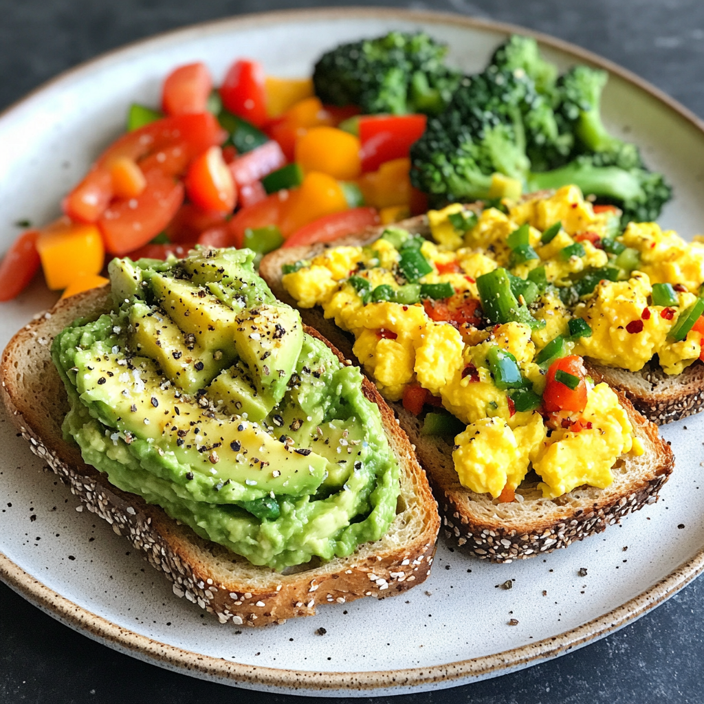 - Assemble by spreading avocado on toast, topping with scrambled eggs and sautéed veggies.