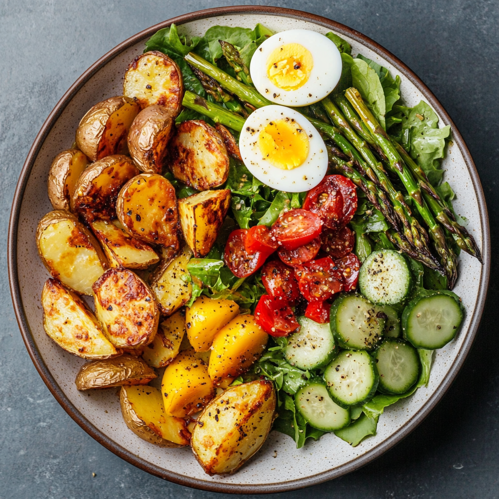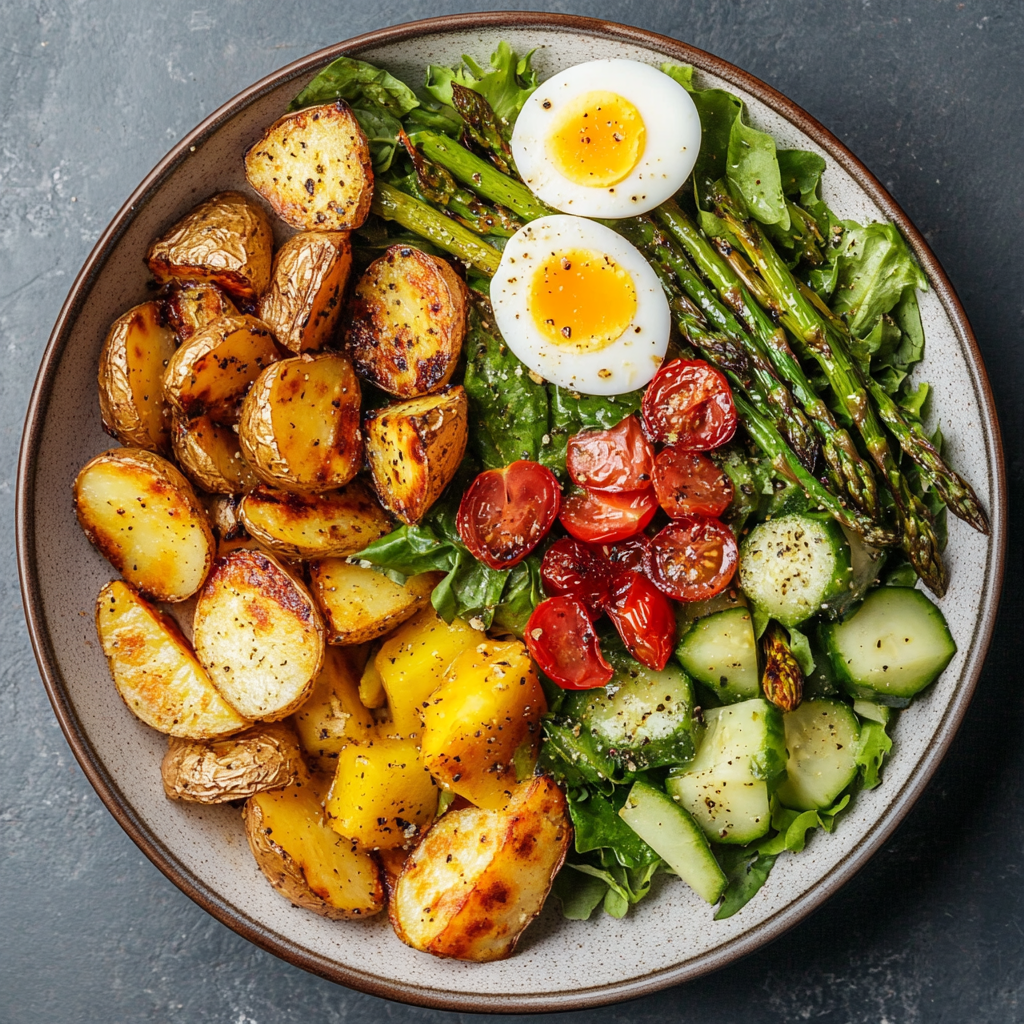 Roasted Potato Wedges with Asparagus, Jammy Eggs & Fresh Garden Salad