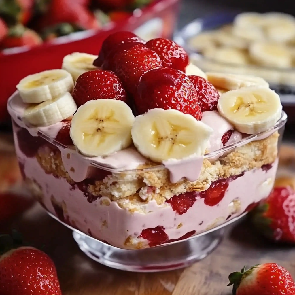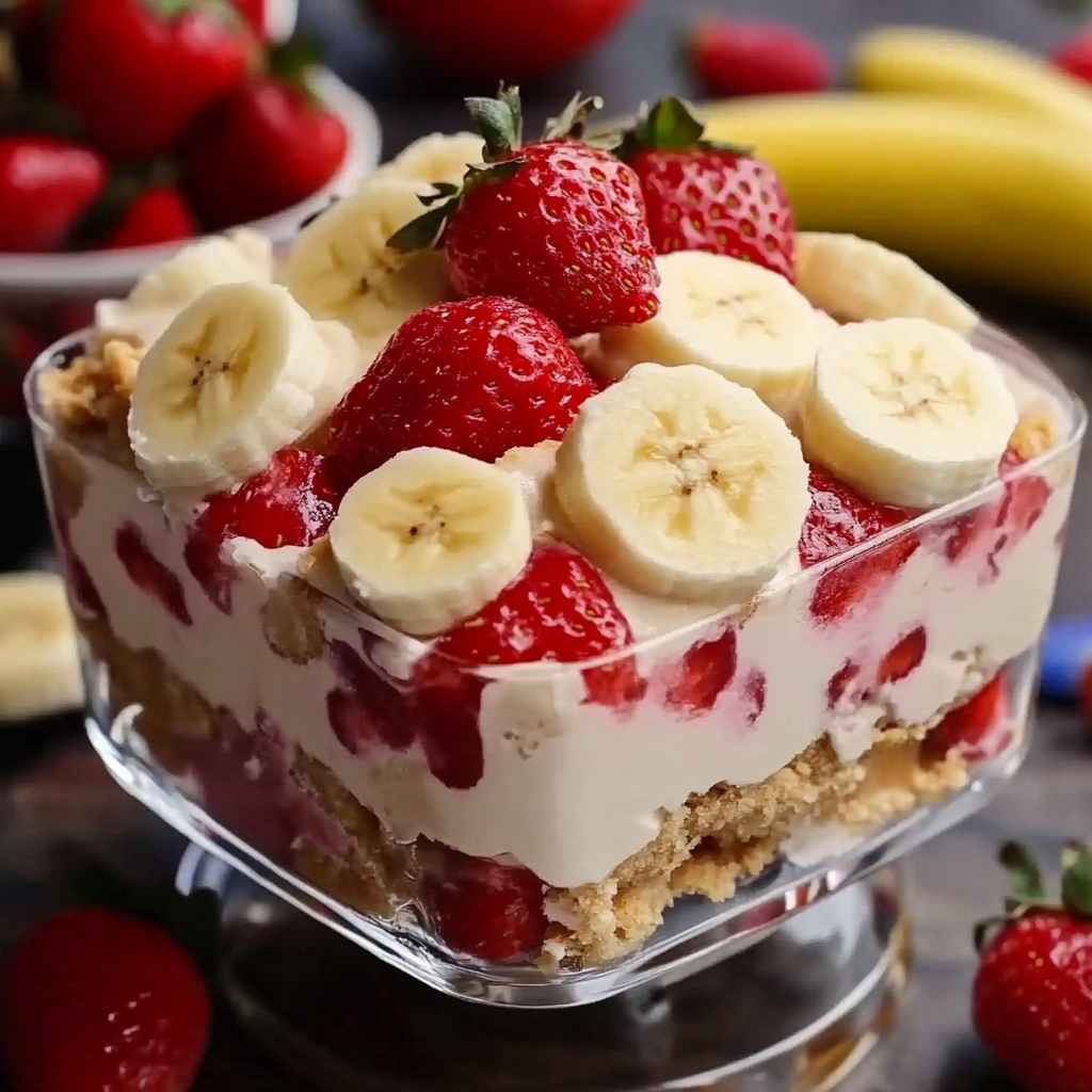 A delightful and creamy dessert combining the flavors of strawberries and bananas with a rich pudding base.